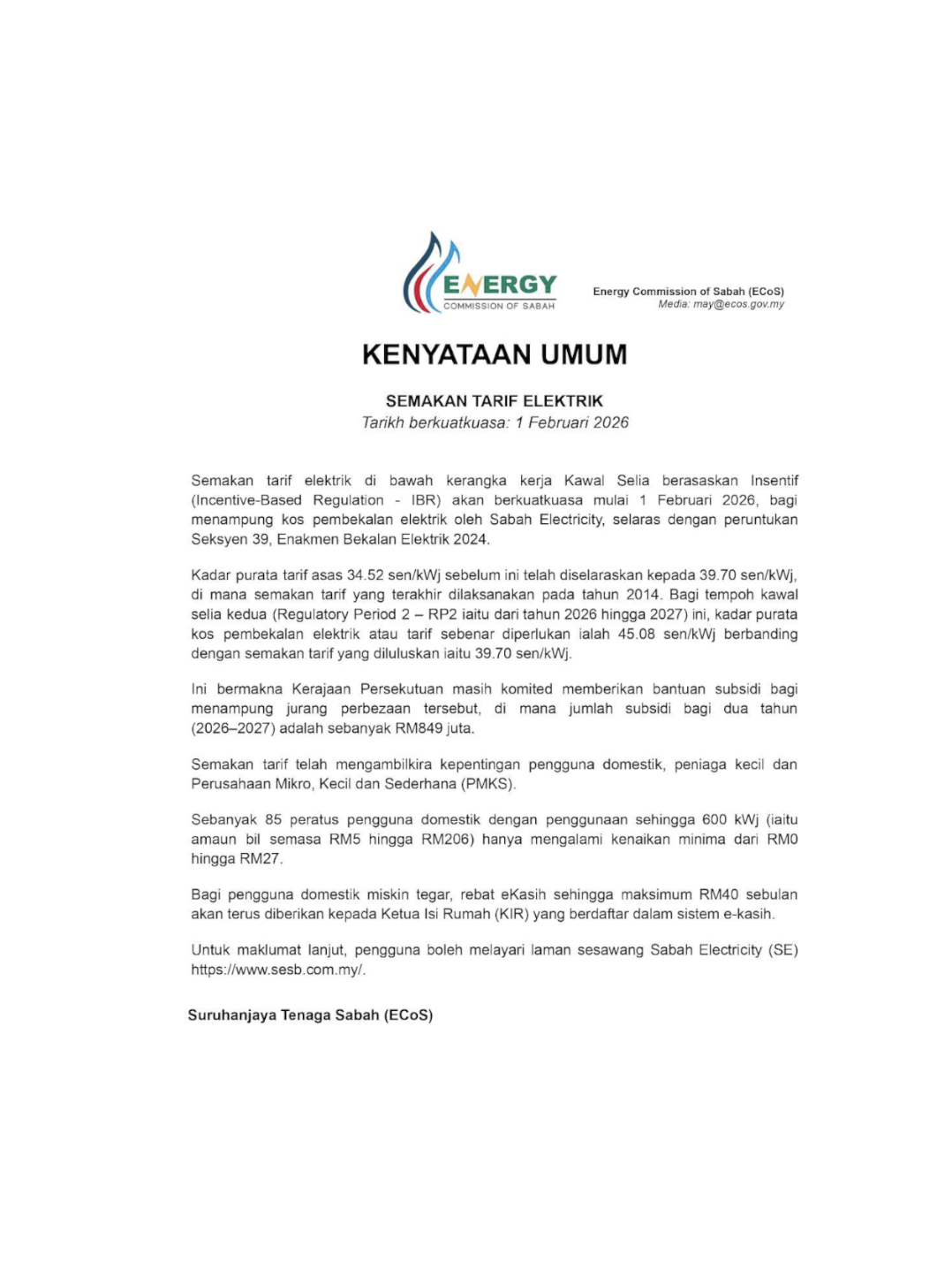 ANNOUNCEMENT - 99% of Sabah Electricity Users Will Not Be Affected By The Electricity Tariff Adjustment (Surcharge) Implemented Under the Imbalance Cost Pass-Through (ICPT) Mechanism