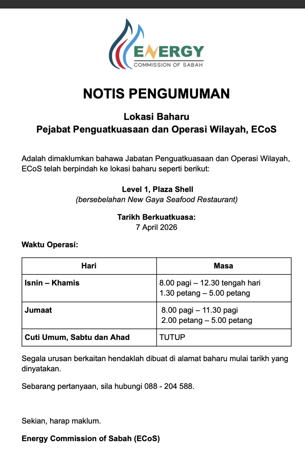 Lokasi Baharu Pejabat Penguatkuasaan dan Operasi Wilayah, ECoS