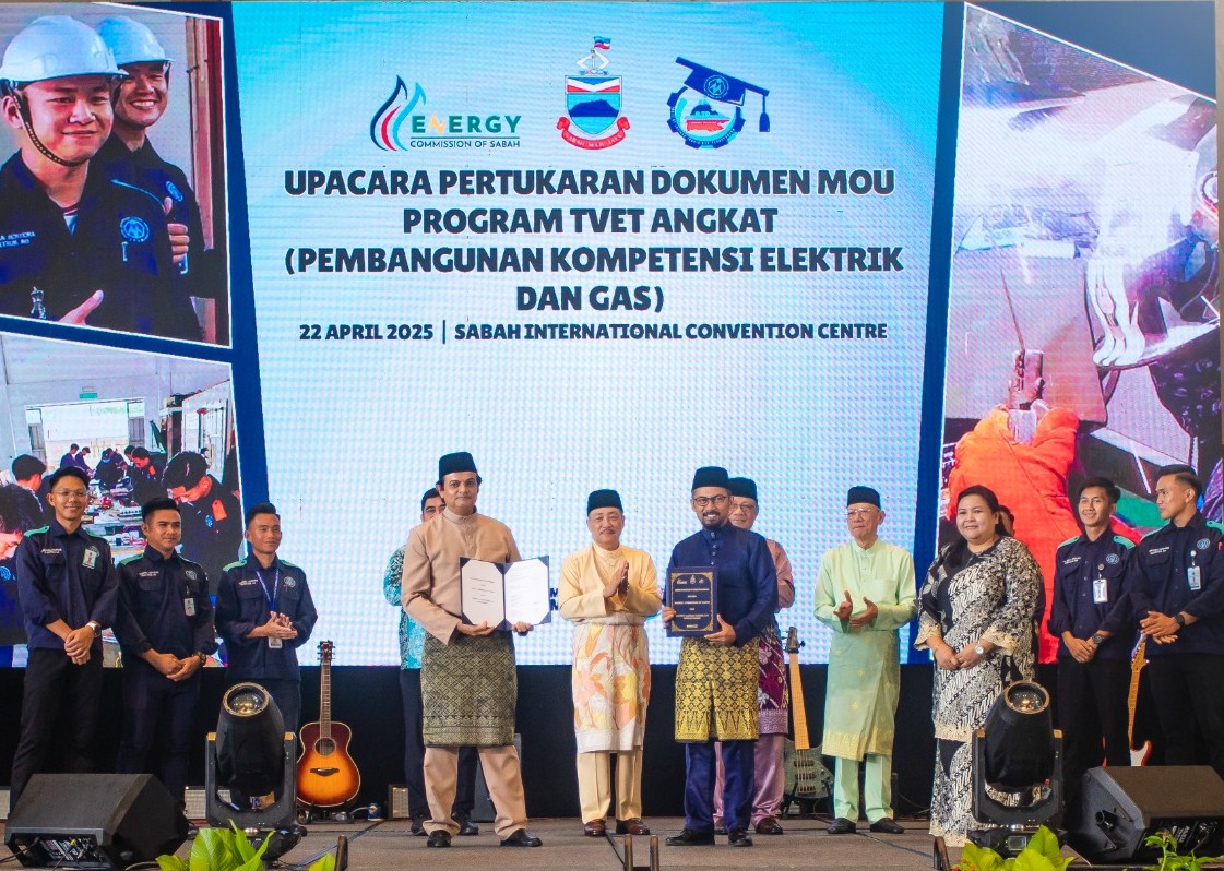 KOTA KINABALU, 22 April – Energy Commission of Sabah (ECoS) dan Institut Latihan Teknik dan Perdagangan, Jabatan Pembangunan Sumber Manusia (ILTP, JPSM) telah menandatangani Memorandum Persefahaman (MoU) di Sabah International Convention Centre (SICC) hari ini. Program TVET Angkat (Pendidikan dan Latihan Teknikal dan Vokasional) ini memberi tumpuan kepada pembangunan kompetensi dalam bidang elektrik dan gas bagi melahirkan tenaga kerja mahir yang berdaya saing dalam industri tenaga, sekaligus membuka peluang kerjaya yang lebih luas untuk belia Sabah. Ketua Menteri Sabah, Datuk Seri Haji Hajiji Haji Noor yang juga Menteri bertanggungjawab dalam portfolio Tenaga berkata, "Melalui program ini, kita akan memastikan belia Sabah dilatih dalam bidang elektrik dan gas, menyediakan mereka dengan kemahiran berasaskan kompetensi sebenar industri dengan pengiktirafan daripada ECoS." Beliau menambah bahawa program ini juga mampu melatih lebih ramai usahawan Bumiputera dalam industri tenaga dan menyediakan laluan kerjaya yang jelas dari peringkat kemahiran asas sehingga ke tahap profesional. Ketua Menteri turut menyatakan harapan agar Program TVET Angkat ECoS ini dapat membina hubungan profesional di antara agensi kawal selia negeri Sabah dan ILTP, JPSM serta memperkukuhkan platform bagi pendidikan berterusan selaras dengan Pelan Induk dan Halatuju Tenaga Sabah 2040 (SE-RAMP 2040) yang dilancarkan pada bulan September 2023. Pelan ini dirangka untuk memenuhi keperluan tenaga negeri dengan memastikan bekalan tenaga yang selamat, boleh dipercayai, dan mampan, dan ini termasuk tanggungjawab ECoS untuk meningkatkan kualiti modal insan di Sabah. Majlis Pertukaran Dokumen MoU telah disaksikan oleh Ketua Menteri Sabah, Datuk Seri Haji Hajiji Haji Noor dan Setiausaha Tetap Kementerian Sains, Teknologi dan Inovasi Sabah, YBhg. Datuk Mohd Hanafiah bin Datuk Haji Kassim. Dalam majlis tersebut, Kerajaan Sabah diwakili oleh Datuk Ir. Abdul Nasser Abdul Wahid, Ketua Pegawai Eksekutif ECoS, manakala pihak ILTP, JPSM diwakili oleh Puan Kamsiah binti Ibrahim, Pengarah Jabatan Pembangunan Sumber Manusia.